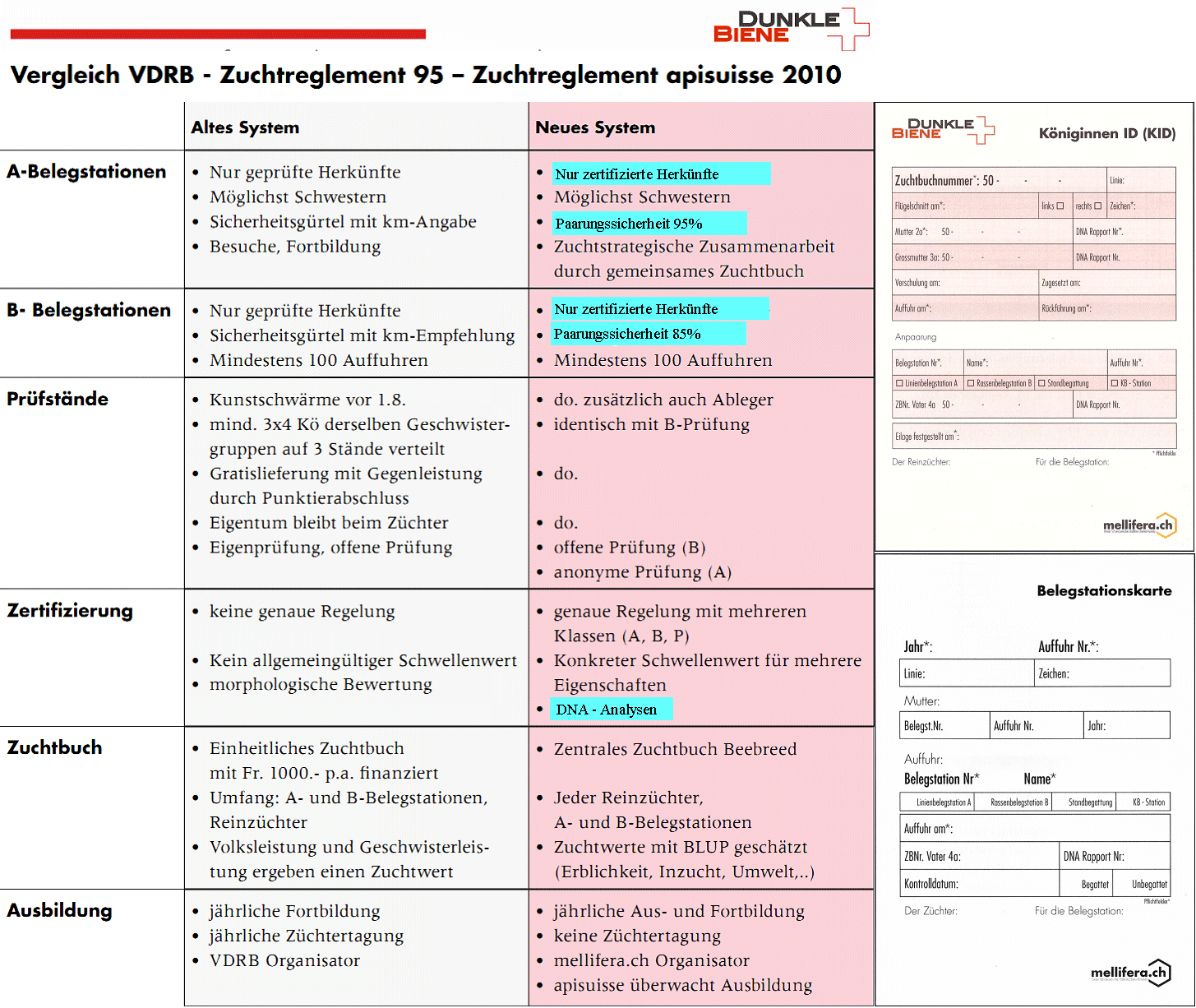 Per Ende 2009 haben sich VDRB und Kantonalverbände zugunsten anderer wichtiger Aufgaben von der Finanzierung der Zucht zurückgezogen. Damit endet das VDRB-Zuchtreglement 95 und die neue Regelung nach apisuisse tritt in Kraft. Ab 2010 fliessen die Beiträge an die Zuchtarbeit aus der Kasse des Bundesamtes für Landwirtschaft direkt an apisuisse und von da an mellifera.ch. Das BLW verlangt für das Entrichten von Beiträgen die Einhaltung von Mindestanforderungen. Dazu musste das bisherige Zuchtreglement angepasst werden. Eine Gegenüberstellung des vergangenen und des neuen Systems zeigt eine Übereinstimmung in den meisten Punkten. Wichtigster Unterschied ist, dass der VDRB jahrelang Beiträge ausbezahlte, ohne die Einhaltung der Bestimmungen zu fordern, während im neuen Reglement vielerorts steht: «Beiträge werden nur ausbezahlt, wenn...». Wir erachten diese konsequente Linie als sinnvoll und unverzichtbar für die Qualitätsarbeit an der Mellifera und ihre Erhaltung für die Zukunft. Wir rufen die Züchterkreise auf, heute das umzusetzen, was bereits seit Jahren verlangt und nota bene mit finanziert wurde.